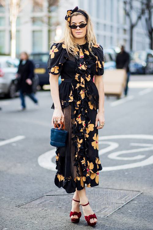 Поєднання одягу в принт та червоного взуття справді працює. Буде плюсом, якщо на сукні уже є натяк на червоний.