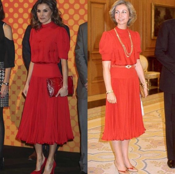 Червоне плаття з спідницею-плісе та коротким рукавом мати короля Іспанії королева Софія демонструвала ще у 1980 році, коли відвідувала Данію з офіційним візитом. Невістка Софії Грецької вирішила повторити її образ майже через 40 років.