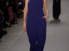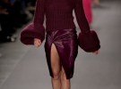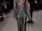 Дівчата дефілювали по подіуму в строгих однотонних вбраннях без декору. Прикрасою дизайнер обрав оксамитову тканину для спідниці, металева для брючного костюма та штучну шкіру для короткої сукні зі складчастим низом.