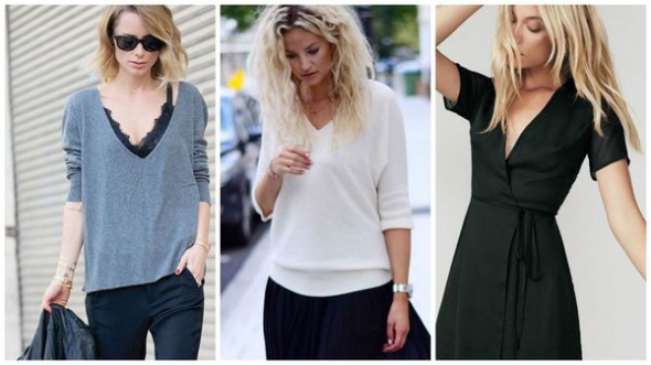 Одяг з V-подібним вирізом. Такий виріз візуально витягує силует та робить його стрункішим. Комір підходить всім типам фігури.