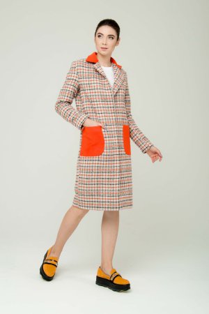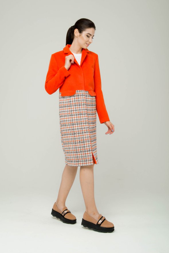 Червоно-помаранчевий один з найяскравіших кольорів за версією Pantone. Він символізує листя з осіннього лісу, тепло і домашній затишок. Саме земляний помаранчевий прекрасно виглядає на всіх тканинах курток, пальто, суконь і штанів.
