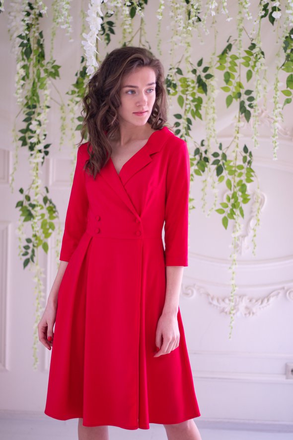 Довга сукня-міді червоного відтінку з V-подібним коміром добре підійде для любителів класики. На перший погляд воно досить консервативне, але яскравий колір додає йому родзинки. Також не варто експериментувати з макіяжем і зачіскою. Легко підкресліть погляд і зберіть волосся.