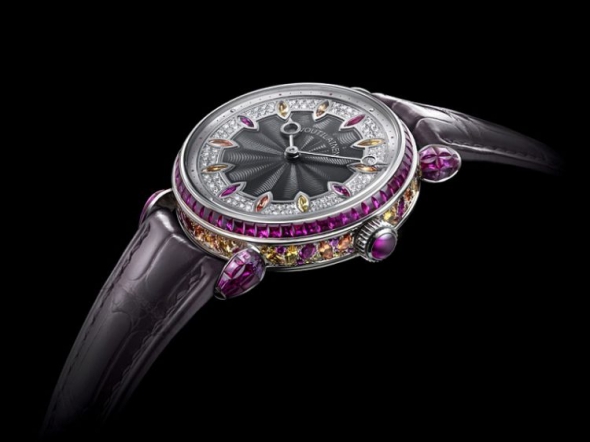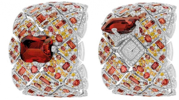Масивний браслет годинника створений із білого золота. Прикрашений дорогоцінним камінням жовтого, білого та червоного кольорів. Головною прикрасою є червоний морганіт, за яким ховається циферблат.