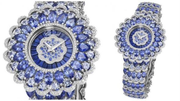 Розкішний годинник зроблений з білого золота. Повністю прикрашений сапфірами та діамантами.