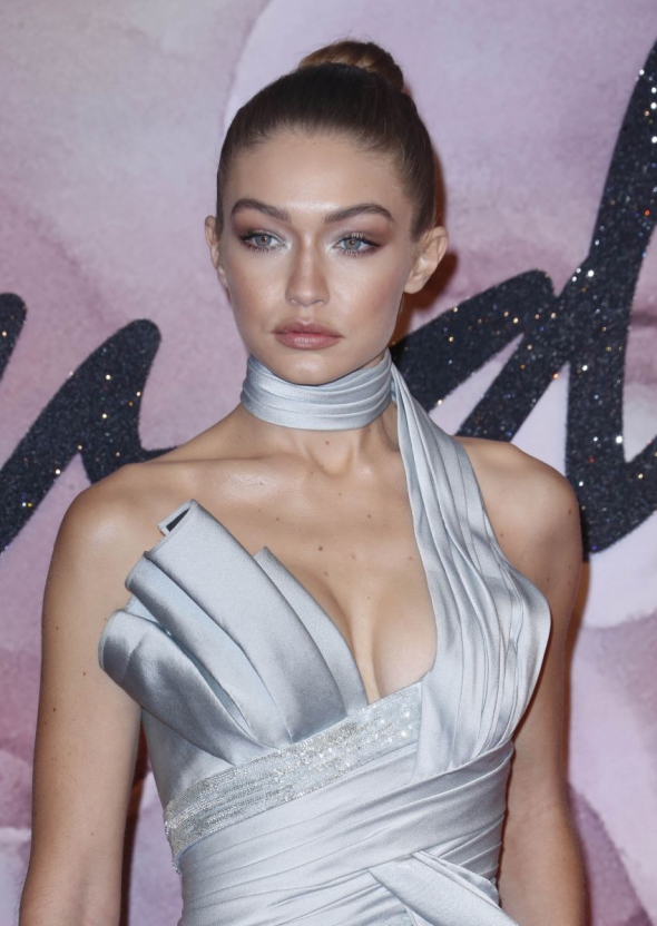 Макіяж Джіджі тяжів до природності. Ніжно-коричневі тіні та срібні блискітки на внутрішніх куточках очей, широкі брови, трохи рум'янцю та нюдові губи. Зачіска — тугий пучок на затилку.