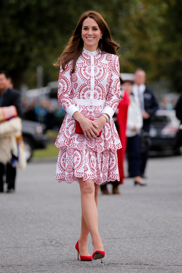 У другий день візиту Кетрін обрала вбрання бренду Alexander McQueen в біло-червоних кольорах. Вдало підібрала аксесуари: туфлі та клатч в тон до наряду. У цей день вони з принцом Вільямом побували у Ванкувері.