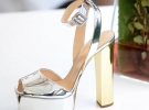 Новинкою стали моделі з високими квадратними підборами. Вони представлені у золотистому та сріблястому кольорах.