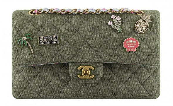 Класичну модель стьобаної сумки представили у кольорі хакі. Барвисту тканину простягнули у тонкому ланцюжку, поверхню прикрасили фірмовими брошками на круїзну тематику.