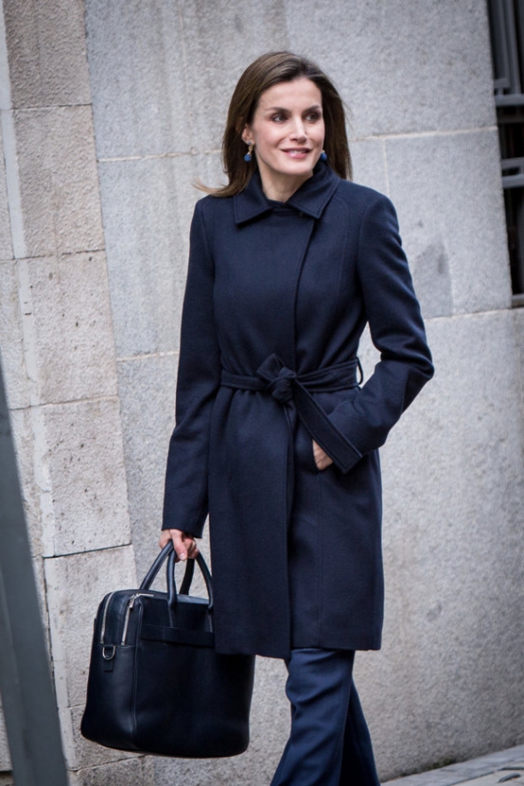 Летиція обрала темно-синій костюм Hugo Boss з брюками вільного крою на манер чоловічих. Костюм доповнила шкіряним портфелем того ж бренду.