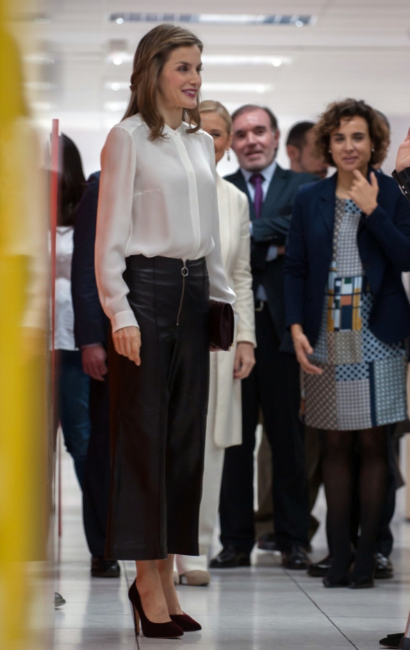 Королева Іспанії Летиція продемонструвала вміння поєднувати в одному образі тенденції сезону та правила ділового стилю. На ювілей однієї з найбільших мультимедійних компанії країни прийшла в шкіряних кюлотах, білосніжній шовковій блузі та витончених туфлях-човниках. Доповнило її образ пальто мінімалістичного дизайну перлинно-сірого відтінку. Летиція з'явилася у супроводі свого чоловіка короля Філіпа.