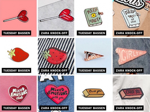 Американський інді-ілюстратор Тьюзді Бессі з Каліфорнії звинуватила бренд мас-маркету Zara у плагіаті авторських принтів. Повтори жінка помітила, уважно розглядаючи нашивки на речах з останньої колекції Zara. Представники торгової марки ці звинувачення заперечують. За їх словами, у ілюстратора немає ніяких підстав. Більш того, вона є незалежною художницею, яку мало хто знає, а вони - впливова корпорація, тому навряд чи цей випадок набуде масштабного розголосу.