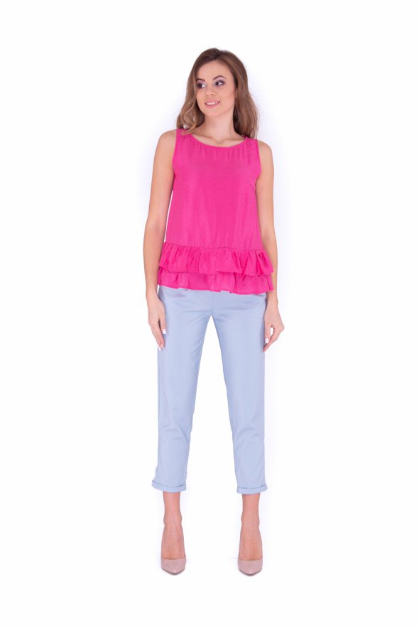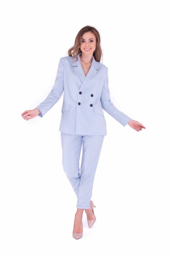Костюм підійде для спекотного літа. Якщо є бажання, сміливо вносьте контраст за допомогою топів або футболок інших кольорів, чим яскравіші вони будуть, тим краще. Рукав піджака можна підкотити і таким чином, ви зробите літній лук. Доповніть ваш стиль туфлями на високих підборах.