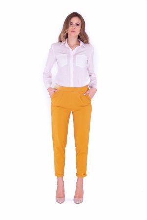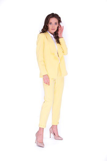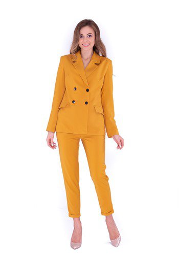 Костюм кольору "куркума" ідеально підходить для сонячного дня. Його головні переваги, він підходить практичним всім типам дівчат і сидить ідеально на всіх фігурах. Відмінною рисою такого костюма буде легкий матеріал, кишені на піджаку і виразні гудзики. Що стосується штанів, то вони в такому стилі обов'язково повинні бути звужені, інакше можна втратити елегантність.