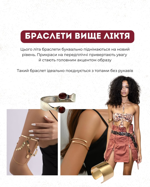 Цього літа браслети буквально піднімаються на новий рівень. Прикраси на передпліччі привертають увагу й стають головним акцентом образу. Такий браслет ідеально поєднується з топами без рукавів.