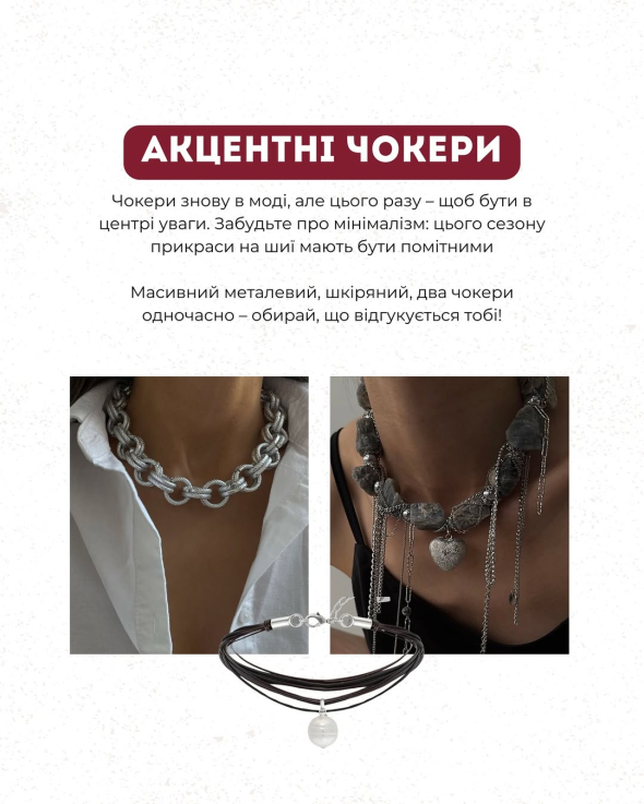 Чокери знову в моді, але цього разу, щоб бути в центрі уваги. Забудьте про мінімалізм, цього сезону прикраси на шиї мають бути помітними. Масивний металевий, шкіряний, два чокери одночасно - обирайте, що подобається вам.