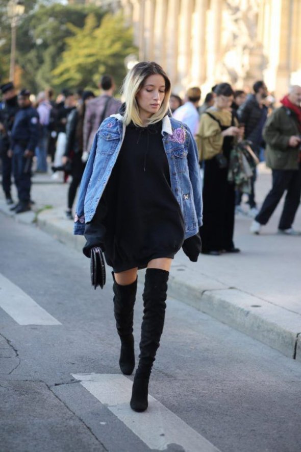 Сукня-світшот також є актуальним варіантом. Можна вибирати моделі різної довжини, але більш пріоритетним є міні. До неї можна взути ботфорти, щоб додати "родзинку" образу.
