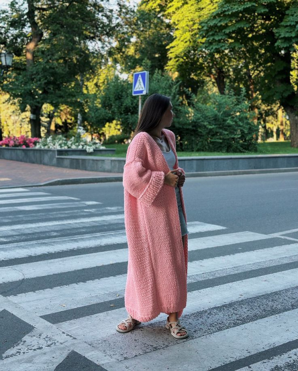 Довгий кардиган до підлоги - один із трендів весни 2025. З приходом тепла він може замінити пальто. Носіть його з сукнями, мініспідницями, джинсами або класичними штанами. Доповнюйте образи кросівками, кедами, балетками чи мюлями.