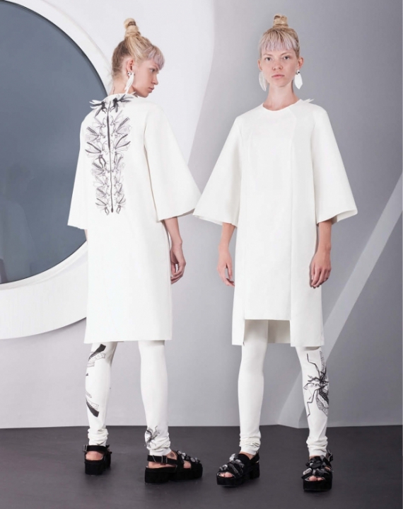 Сукні з багатошаровими спідницями доповнює максимально простий верх з відкритими руками та V-вирізом. Прямі силуети з об'ємними рукавами прикрашені принтами комах на спині з додаванням декору. До них автор пропонує обтягуючі лосини з таким же малюнком. Брюки-кльош з 3D об'ємом у поєднані з легкими блузами виглядають ексцентрично та роблять образ більш зухвалим. Для прихильників форм, Бобкова створила брюки-дудочки на завищенній талії з кофтами, що повністю обліплюють фігуру.
