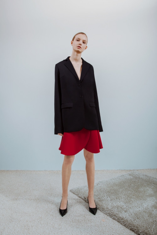 Ключовою моделлю лінійки стала яскраво-червона сукня до щиколотки з коміром-стійкою та складкою від стегна, яка імітує розріз.