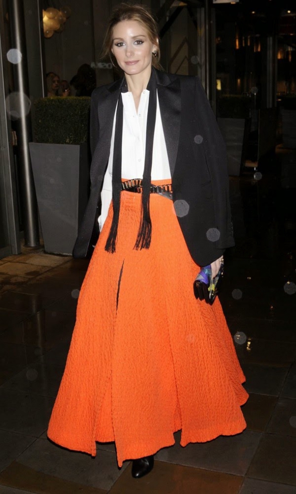 Модель Олівія Палермо створила сміливий образ з помаранчевою спідницею. Вона поєднала її з прямим силуетом чорного піджака, білої блузи та тонкого шарфа.