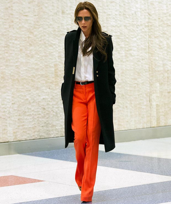 Дизайнер Вікторія Бекхем поєднала помаранчеві брюки-клеш з білою блузою та чорним пальто. Ідеальний варіант яскравого офісного стилю.