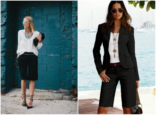 Модель класичного стилю можна носити з сорочкою, доповнюючи шкіряним паском, краваткою, туфлями на підборах. Такі бермуди повинні мати вигляд укорочених офісних брюк.