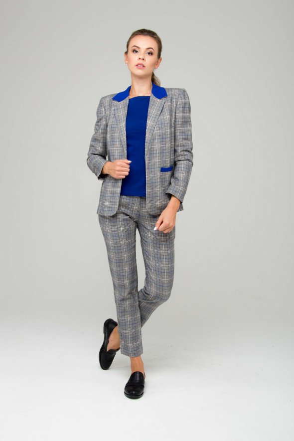 Картатий жакет допоможе створити модний класичний look. Можна надіти жакет в клітку з підкороченими брюками, джинсами. Що найприємніше для всіх любительок спідниць, саме картатий жакет можна підібрати до спідниці будь-якого фасону і довжини. Ефектно виглядають однотонні спідниці такого ж кольору, як клітинка жакета. Наприклад, під міні-спідницю піджак-оверсайз. Під спідницю-"олівець" вибираємо більш елегантну і приталену модель.