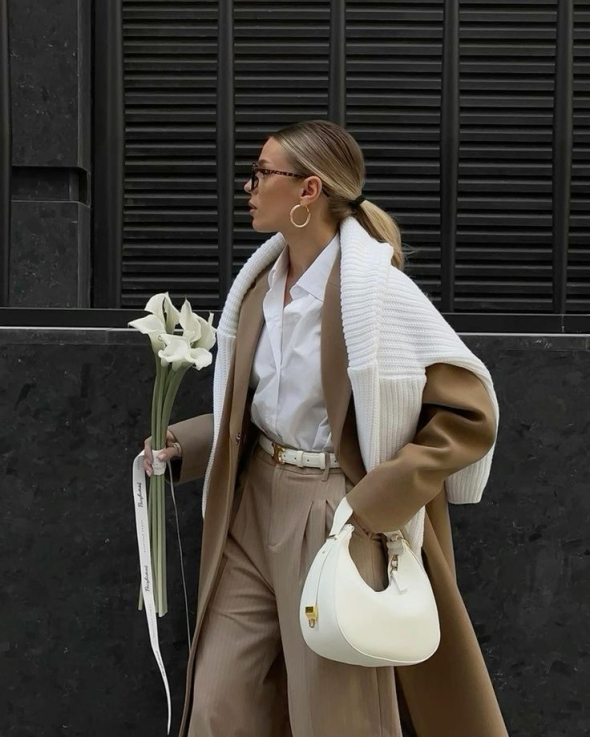 У такому вигляді можна ходити не лише на роботу, а й на прогулянки чи побачення. Завершіть аутфіт лоферами або черевиками. Аксесуари повинні бути мінімалістичними, без зайвих деталей.