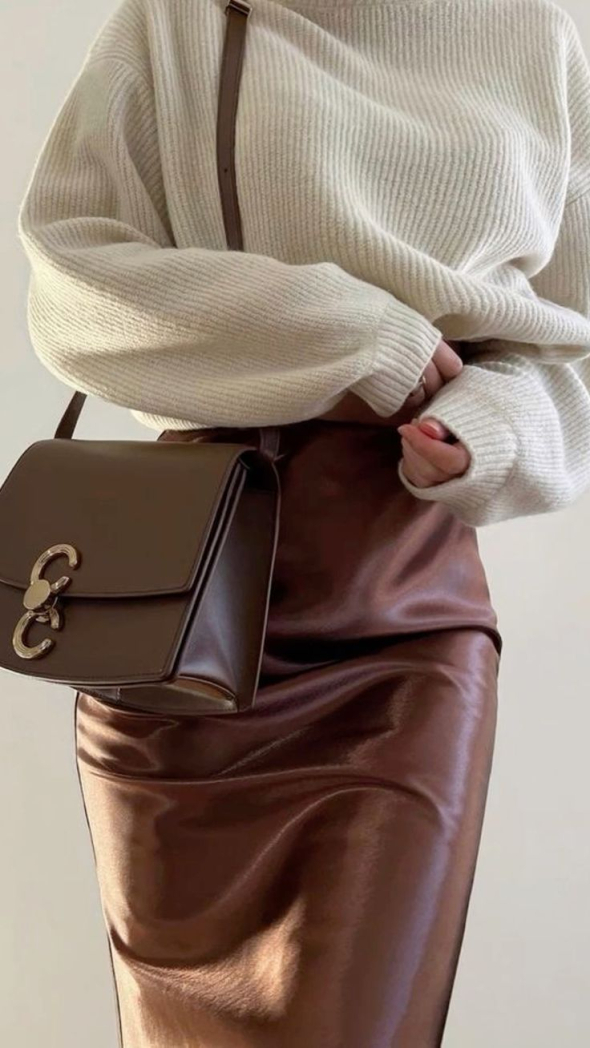 Дизайнери презентували стильні в'язані костюми зі спідницею міді або максі. Вони вдало підкреслять фігуру та створять затишний образ. Якщо бажаєте створювати аутфіт з окремих елементів - обирайте шовкову або спідницю-плісе та в'язаний светр. Додайте високі чоботи на підборах і мінімалістичну сумку.