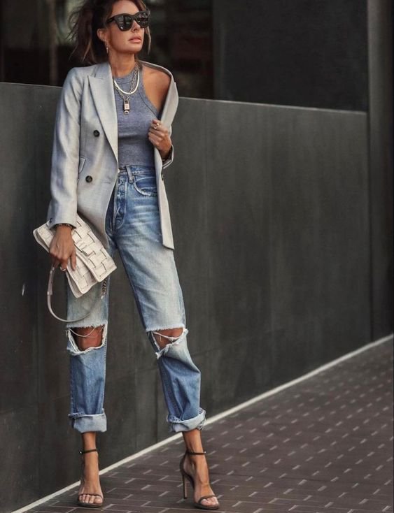 Для ділового образу комбінуйте рвані джинси з туфлями-човниками та подовженим жакетом. Для кежуалу варто обрати кросівки, футболку або трендову майку.