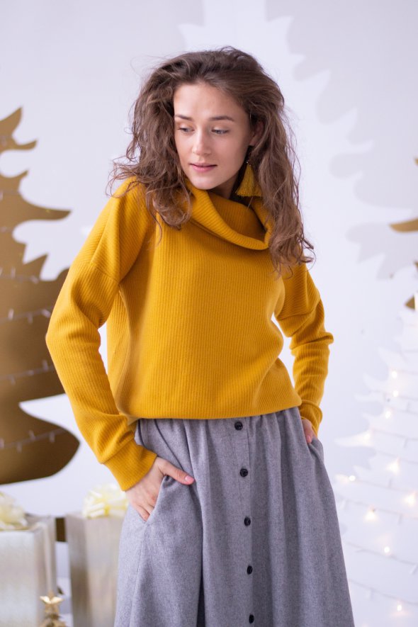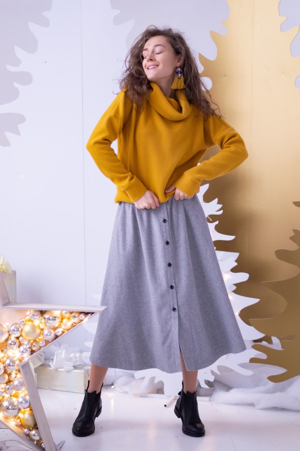 Одним з кращих образів цієї зими стане об'ємний лук. Для холодних днів довга вовняна спідниця буде найоптимальнішим варіантом. Вона не обов'язково повинна бути до підлоги, сьогодні міді - модна довжина. Тепла спідниця-міді нейтрального кольору і гірчичний гольф зроблять вас легкою і невимушеною.