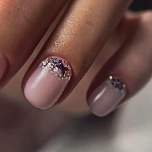 Якщо однотонний варіант манікюру для вас занадто нудно і просто, то доповнити можна стразами-сотами під кутикулу.