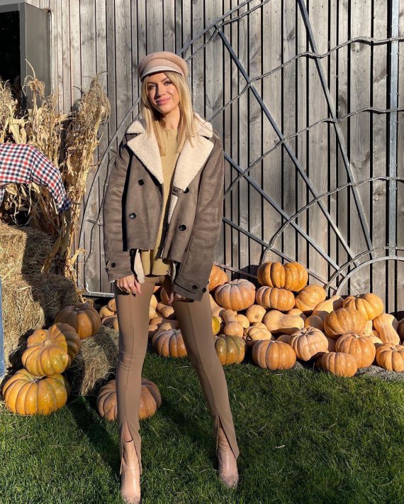 Блогерка опублікувала кадри з ніжної фотосесії. Позувала на тлі інсталяції з гарбузами. Нікітюк захопила фанів трендовим образом: постала в укороченій шкіряній дублянці, що є особливо актуальною цієї осені, бежевих світері, кепі й штанах із розрізами. Доповнила образ ботильонами на підборах із квадратним носком.