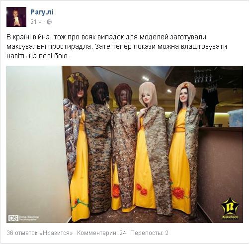 "В країні війна, тому про всяк випадок для моделей заготовили маскувальні простирадла. Зате тепер покази можна влаштовувати навіть на полі бою", - зазначив автор поста.