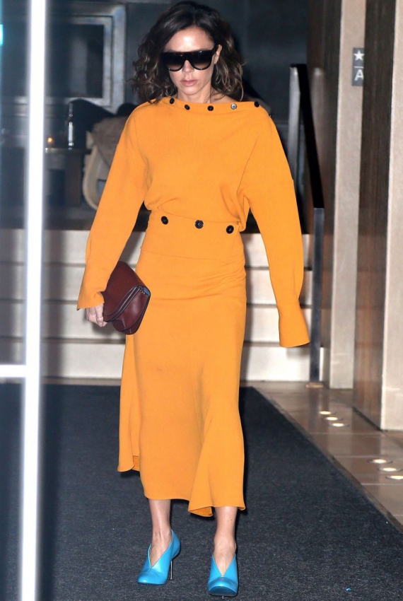 Вікторія була одягнута у костюм яскраво-помаранчевого кольору - топ з чорними ґудзиками та довгу спідницю в тон. Вбрання доповнила блакитними черевиками на підборах.