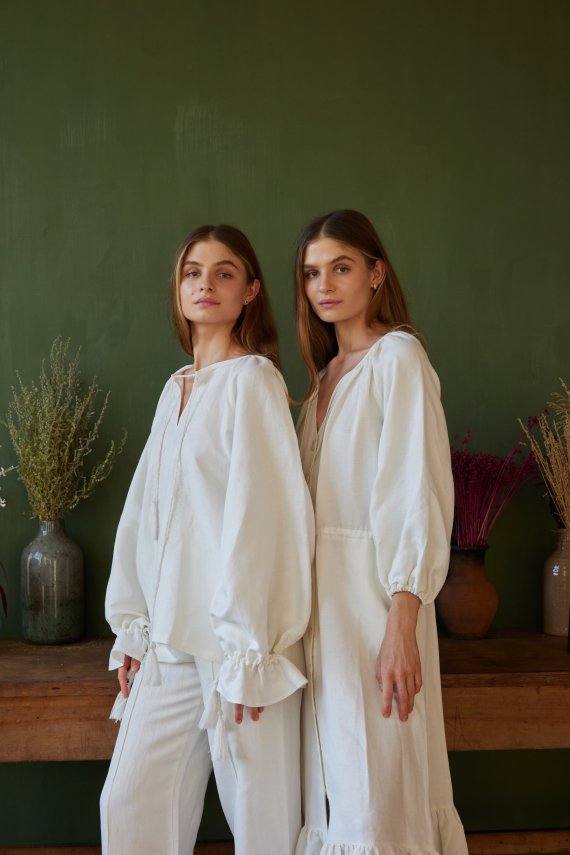 Сукня з цією вишивкою - це національні мотиви в поєднанні з модними трендами. Вироби зшиті з органічного льону. Вишивка, зав'язки з китицями на сукнях і блузах - із шовкової нитки.