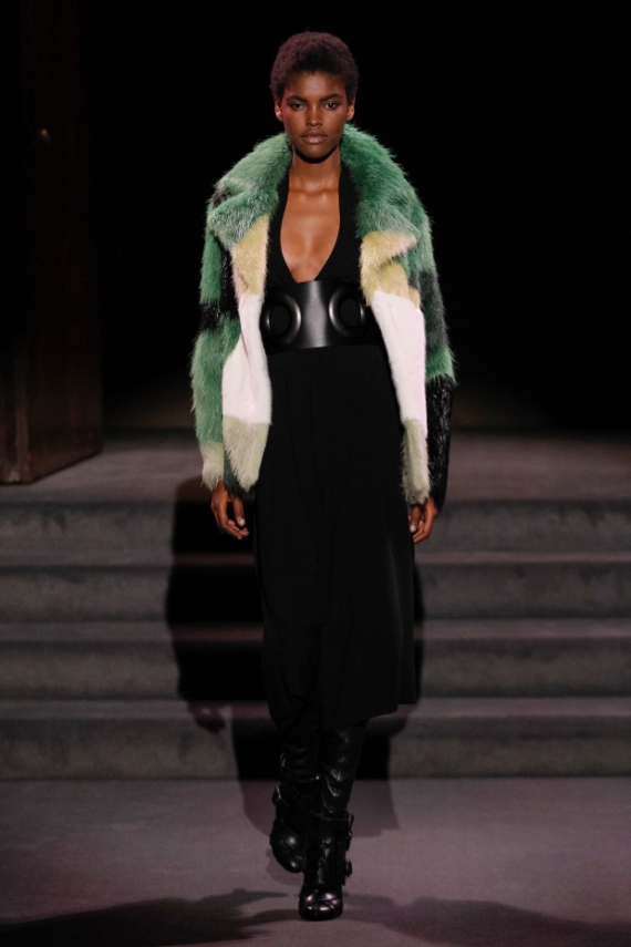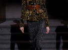 Моделі вийшли на подіум у спідницях-олівцях, приталених жакетах та светрах з глибоким V-подібним вирізом. Знову в моді тигровий принт — закриті сукні міді у поєднанні з шкіряних товстим паском. До вечірнього виходу автор запропонував подовжені кофти повністю усипані блискітками та пухнасті спідниці максі. Також представлені класичні чорні сукні з глибоким декольте та товстим декорованим ременем.
