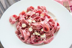 Для приготування вистачить 30 хвилин. Потрібно 180 грамів борошна, 50 грамів кисломолочного сиру, один жовток, 20 мілілітрів бурякового соку, одна столова ложка соняшникової олії, 20 грамів вершкового масла та сіль.