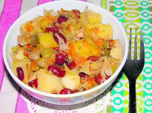 —?Мариновані — солодкі, а треба кислі. Ріжу кубиками десь як квасолина. Покриваю водою і ставлю на малий вогонь на годину. Начищаю й нарізую кіло картоплі. На підчеревині підсмажую дві великі цибулини й крупно натерті дві морквини. Як ребра відстають від кістки, кладу до них картоплю, висипаю з юшкою квасолю. Квасоля має бути добре зварена, а юшка аж мутнувата. Не солю, бо віддасть сік. Туди ж — огірки, цибулю з морквою. Поки хвилин 15 тушиться, насікаю півлітрову баночку капусти.