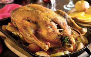 — У глибоке деко закладаю решітку для запікання. Викладаю на неї качку черевцем догори. Ставлю в розігріту до 200 градусів духовку. Коли грудка підрум'яниться, перевертаю на спину. Чекаю, доки й там утвориться скоринка.