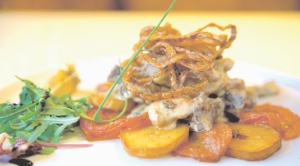 — М'ясо ріжу соломкою, 10 хвилин обсмажую на вершковому маслі. Додаю 50 грамів грибів-лисичок, ще через 10 хвилин заливаю 100 грамами вершків, й ще 5 хвилин тушкую. Потім солю й перчу. Викладаю на тарілку, зверху прикрашаю смаженими кільцями цибулі. Обкладаю смаженими на олії помідорами. Їх треба лиш злегка протушкувати 2 хвилини. Потім колом викладаю картоплю. Відварюю її "в мундирі", кришу кільцями й обсмажую на вершковому маслі до золотистої кірки.
