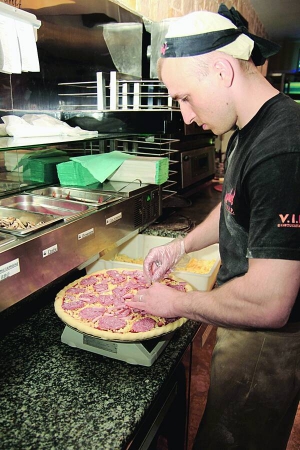 Кухар столичної піцерії Дмитро Дворський, 25 років, готує піцу із салямі, грибами й ананасами. Яєць у тісто не кладе, бо у когось із гостей може бути алергія.
