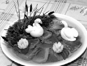 Киянка Лідія Плахотна, 36 років, прикрашає холодець "лебединим озером". Робить його із відвареної моркви, кропу, петрушки, розчинної кави, перцю, кількох листків м"яти та базиліку. Така прикраса пасує також до заливної риби.