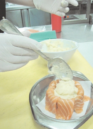 Змащує стінки циліндра вершковим маслом. Опускає в неї скибку філе. Один її край торкається дна дека, другий звисає із банки назовні. Шматки викладає впритул один до одного. В обкладену рибою форму накладає гаряче пюре. По черзі загортає шматки риби на начинку. Одразу ставить у духовку на 8 хв.
