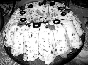 Висипає суміш у форму й вирівнює верх тупим краєм ножа. Ставить масу на кілька годин у холодильник. Коли торт захолодає так, що тримає форму, перевертає його на дерев'яний круг. Обережно знімає плівку. По всьому торту викладає нарізані кільцями маслини, прикрашає листками петрушки.