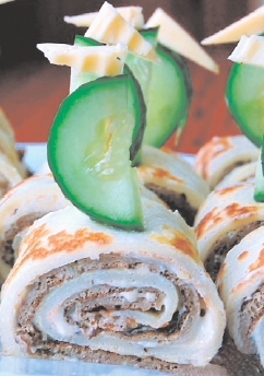 Яєчний млинець тонко змащує часниковим майонезом, зверху кладе печінковий корж. Його теж мастить і скручує рулетом. Налисники ріже навскіс. Прикрашає наколотими на шпажки шматками сиру та огірка. Страва нагадує кораблі з вітрилами.