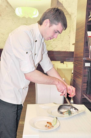 Кухар львівського ресторану "Манускрипт" 22-річний Олег Шрамко готує для клієнтів запечену рибу сібас з овочами та креветками. Цю страву найчастіше замовляють.