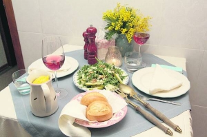 Запрошує до столу. У кухні тьмяне світло. Із кімнати лунає французький джаз. Стіл застелений блакитною скатертю, на ньому — ваза з мімозами, запалена свічка. Поряд два келихи з рожевим іспанським вином.