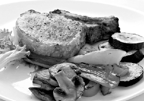Також засмажує свинину на кістці з овочами. Бере один цукіні, баклажан та болгарський перець, кришить великими кубиками. 300 г шампіньйонів ріже навпіл, цибулину — півкільцями.