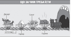 — Починати треба із гарячих та жирних страв. Це м'ясо, голубці, рагу, суп. Потім їжте холодні салати, останніми — гарніри. Після них має бути перерва на 2 години. Тоді можна їсти тістечка. Ще за півгодини корисно випити гарячий чай.
